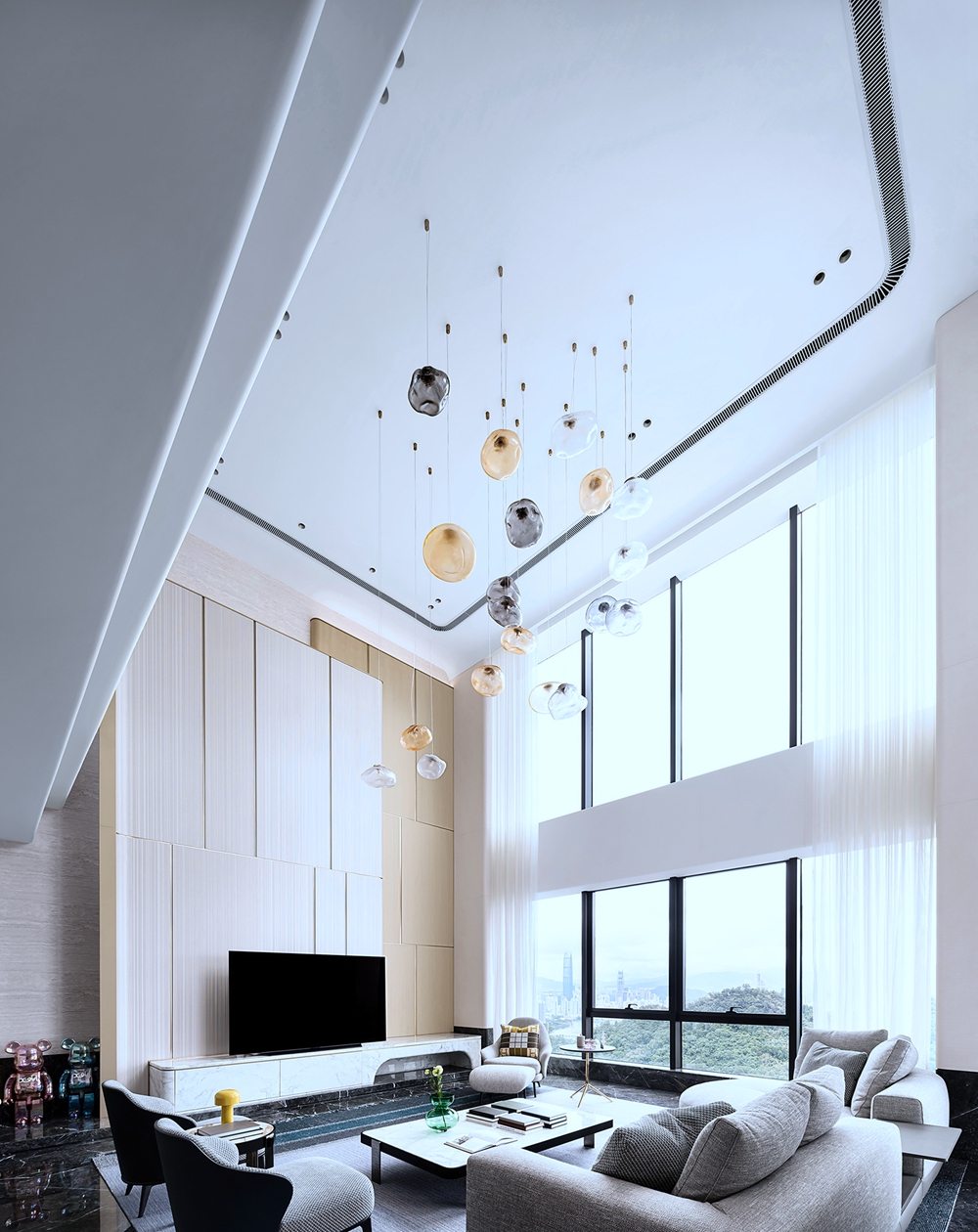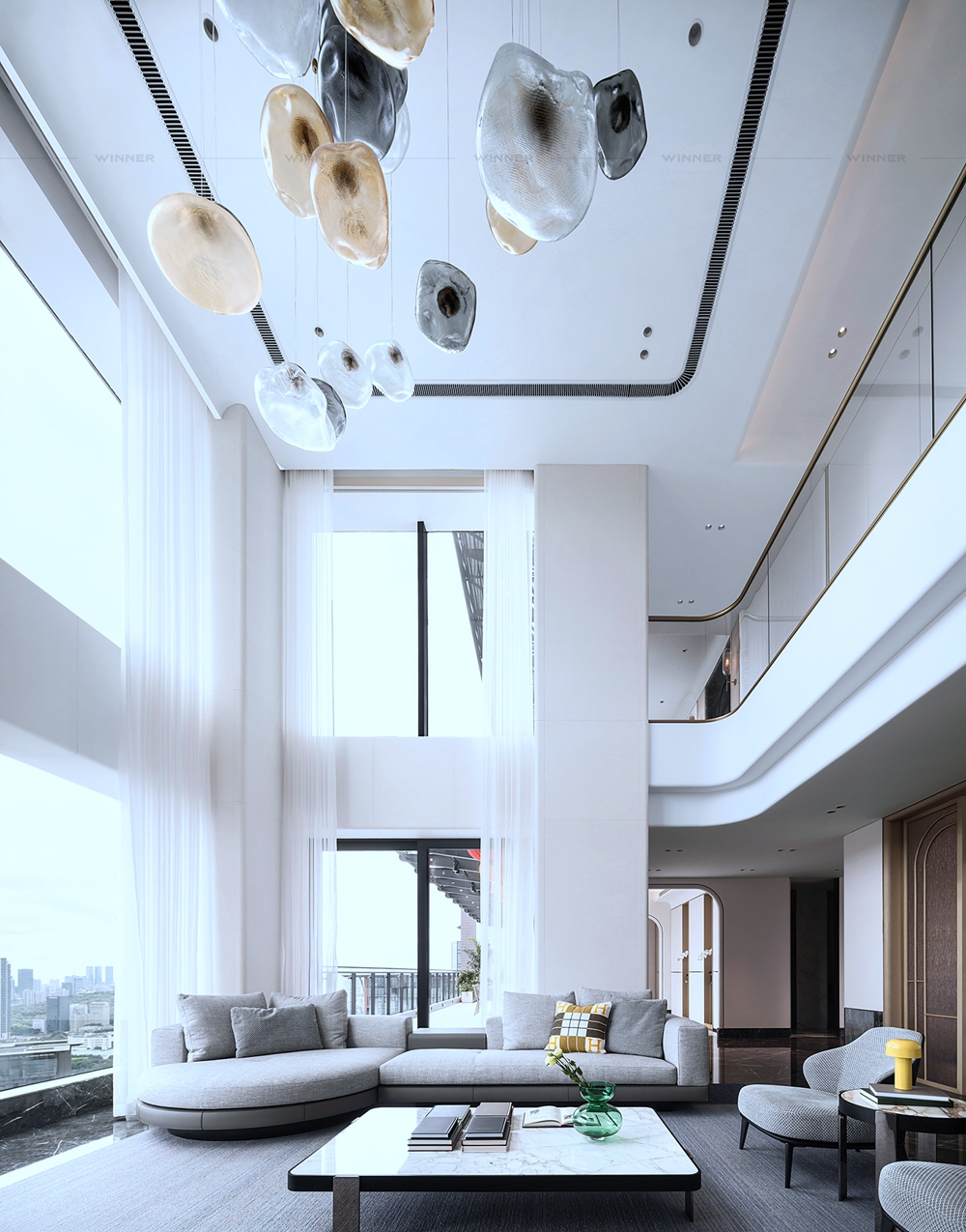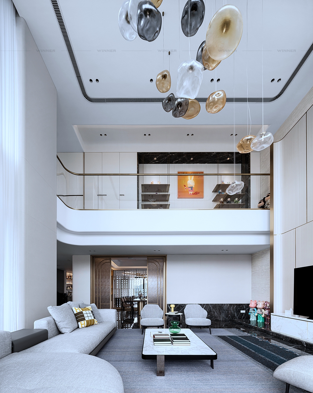 The heart of this penthouse is the double-height living room. Designing for spaces with massive floor-to-ceiling windows requires furniture that anchors the room without blocking the view. We manufactured a custom low-profile grey sectional sofa that perfectly follows the room's layout. To balance the modern aesthetic, we incorporated gentle architectural curves on the upper balcony fascia. This combination of soft upholstery and clean architectural lines is a hallmark of modern luxury.