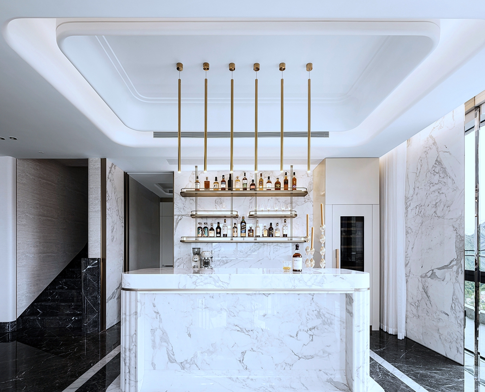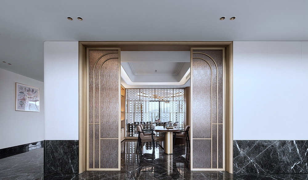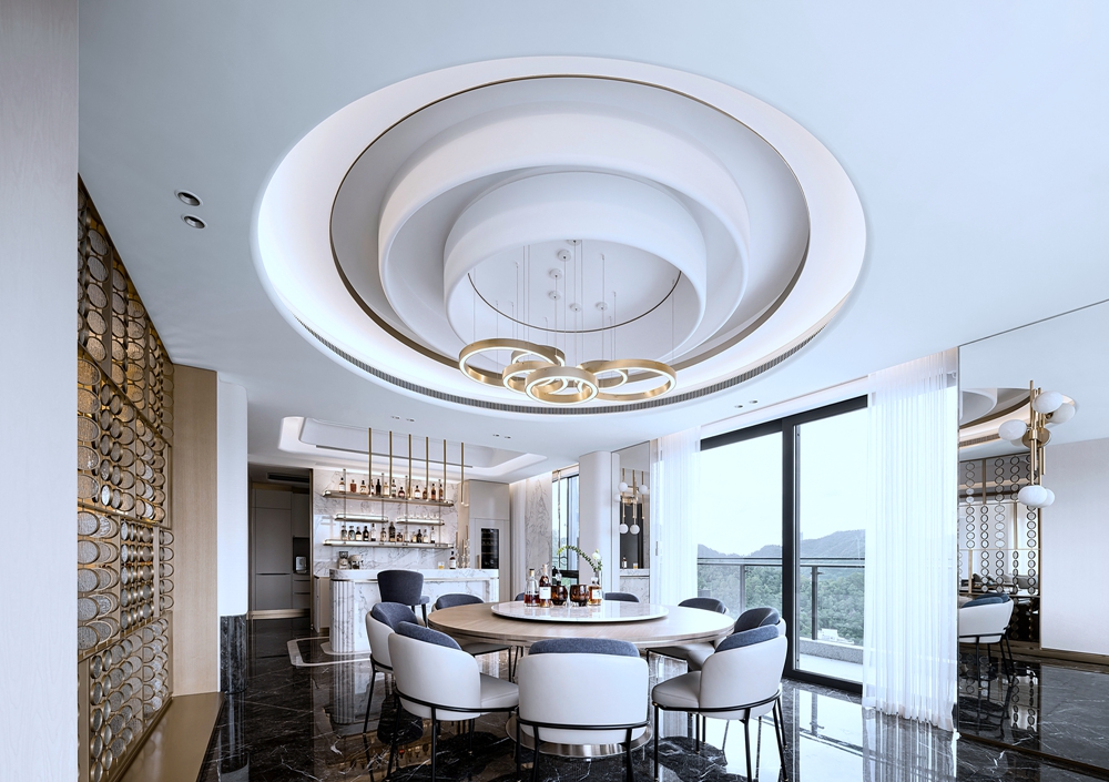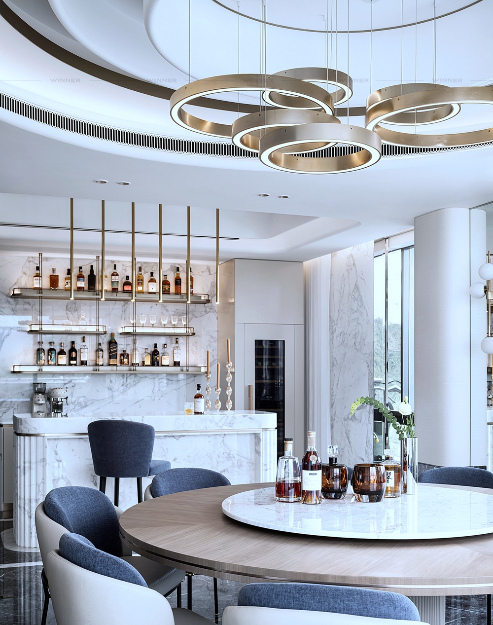 In the main dining space, the ceiling features a massive, multi-layered circular drop design. Below it sits a large round dining table, paired with custom-upholstered chairs featuring dark blue accents and elegant metal legs. But the real showstopper is the integrated wall cabinetry. We built a floor-to-ceiling display wall combining a built-in marble bar counter with an intricate grid of metal and glass shelving. This seamless integration of stone, metal, and wood is exactly why designers rely on our one-stop custom service.