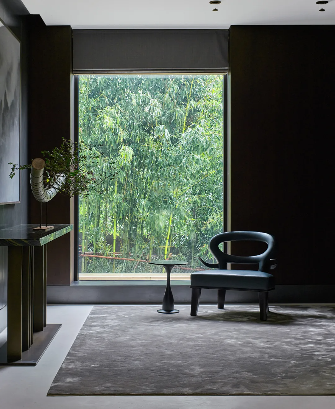 One sculptural accent chair in dark lacquered wood — asymmetric, architectural — sits near the window as both seating and a piece of three-dimensional design. It is the room's most assertive object, and it earns that position.