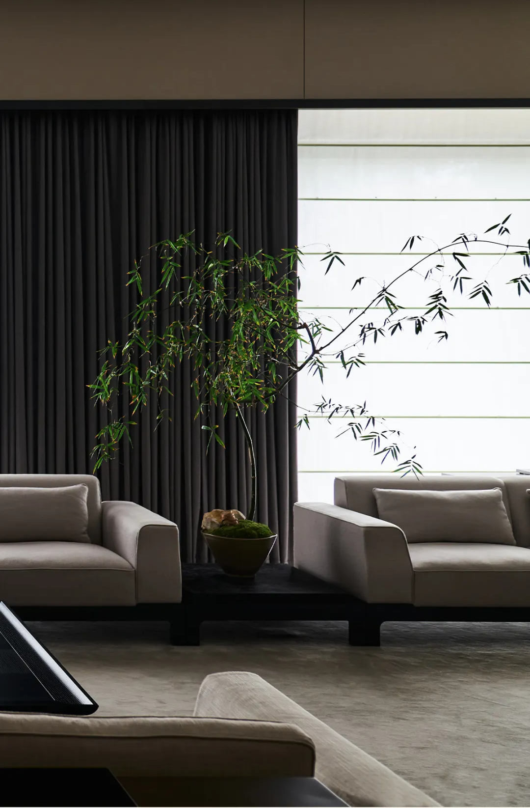 Floor-to-ceiling dark curtains against the large windows create a dramatic contrast with the natural light and greenery visible beyond — a theatrical move that transforms the view into something almost like a living painting. EKAR's furniture color palette was calibrated specifically against this backdrop.