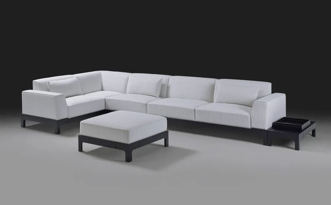 Neutral upholstery that recedes and lets form lead. Warm cream, pale grey, taupe linen. The fabric colors were chosen specifically to not compete with the architecture or the carefully framed views beyond the windows. The sofa silhouette — low, deep, wide — does all the visual work.