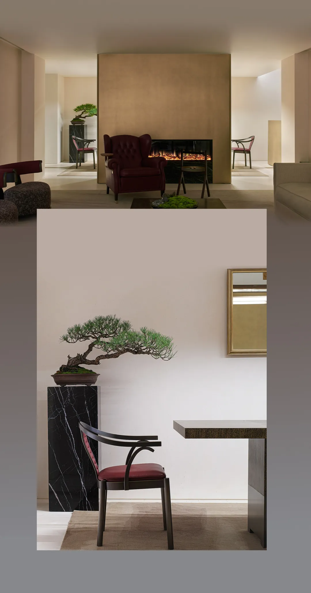 Nature as an active compositional element. In every room, natural elements — a bonsai pine in the study, a branch arrangement on the console, ink-wash landscape paintings — are treated as furniture-level decisions, not afterthoughts. This is a specifically Chinese design instinct: interior space is incomplete without some acknowledgment of the natural world.