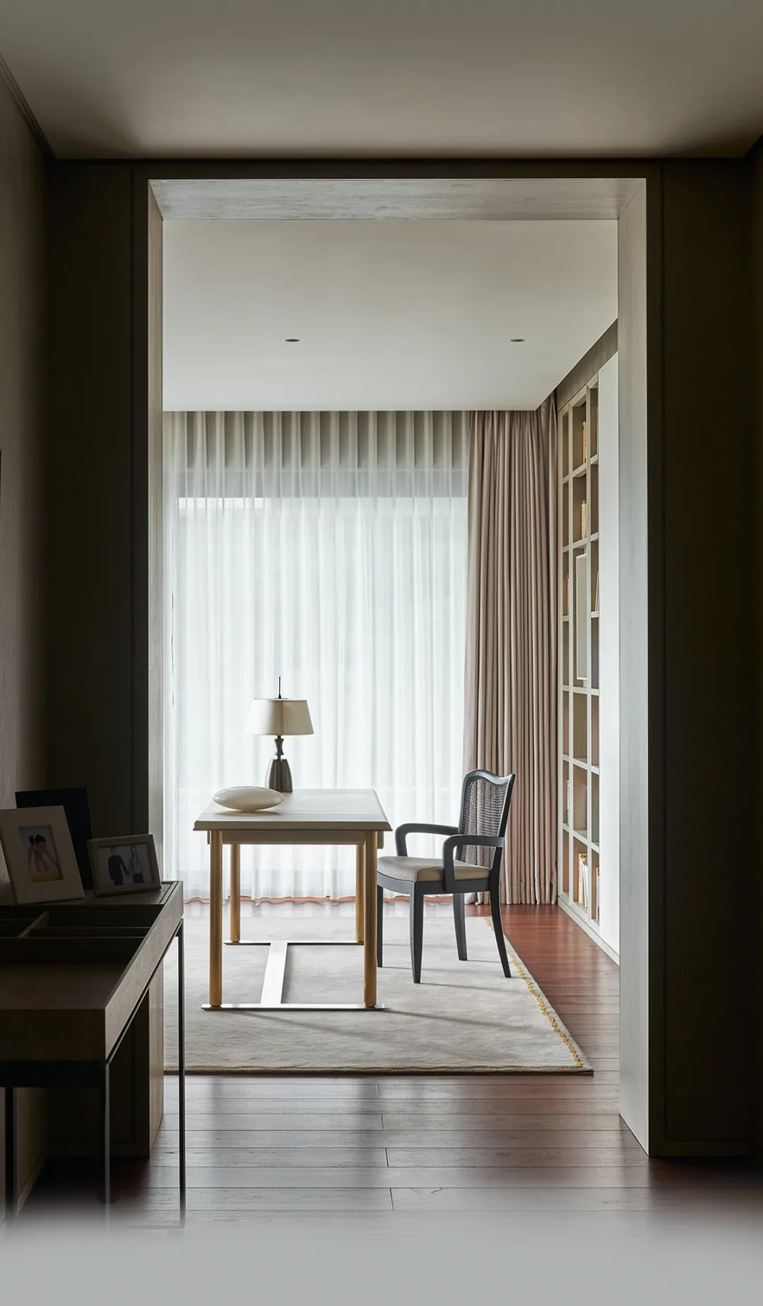 A writing desk at generous scale with clean lines and no unnecessary detail. A reading chair with precise proportions — seat depth, back angle, and armrest height all calibrated for extended use. This is not a decorative study. It is a room genuinely built for thinking.