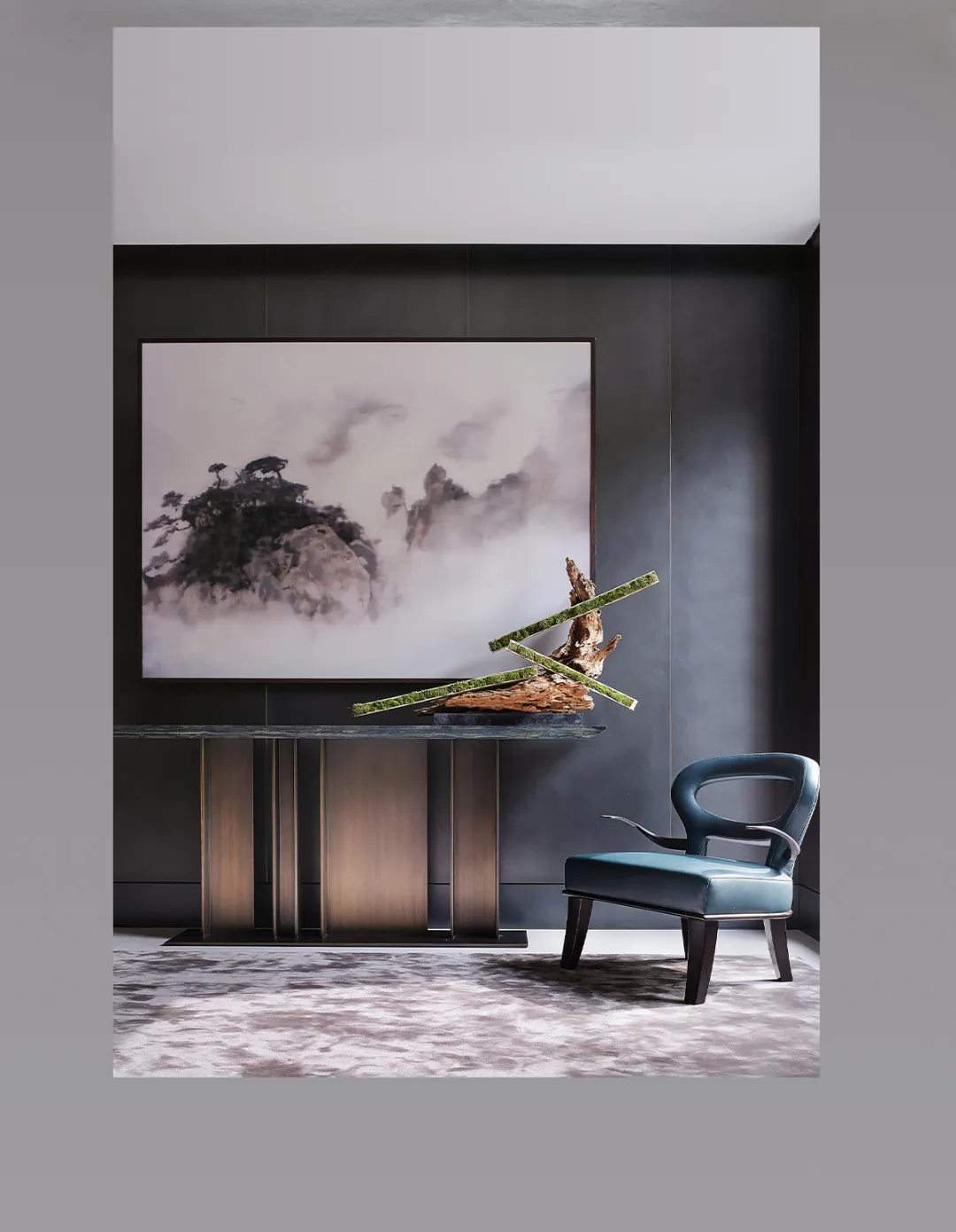 The entrance features a console table in dark solid wood — elongated, low, with a refined apron detail that references classical Chinese furniture joinery without replicating it. Above, a large ink-wash landscape painting. A single decorative object on the console surface.